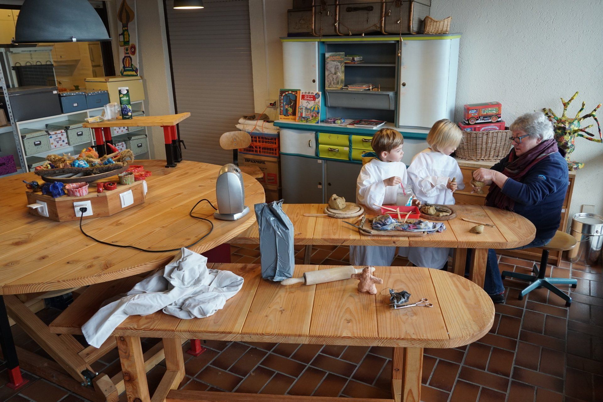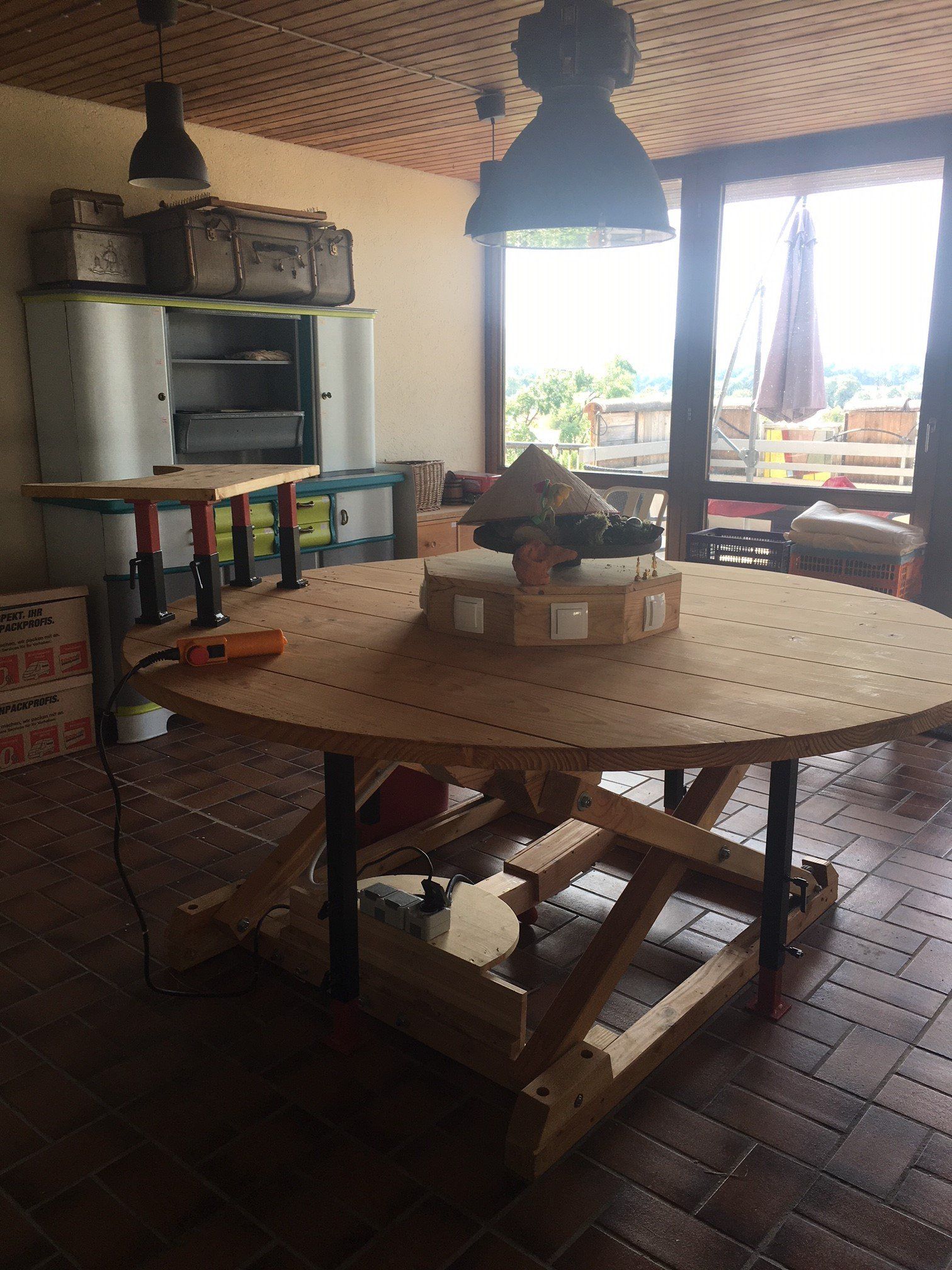 Durch eigens gebauten Tisch, mit Möglichkeit zur Höhenverstellbarkeit und Stromanschlüssen lädt auch dieser zu unterschiedlichen kreativen Beschäftigungen für Menschen jeden Alters ein.